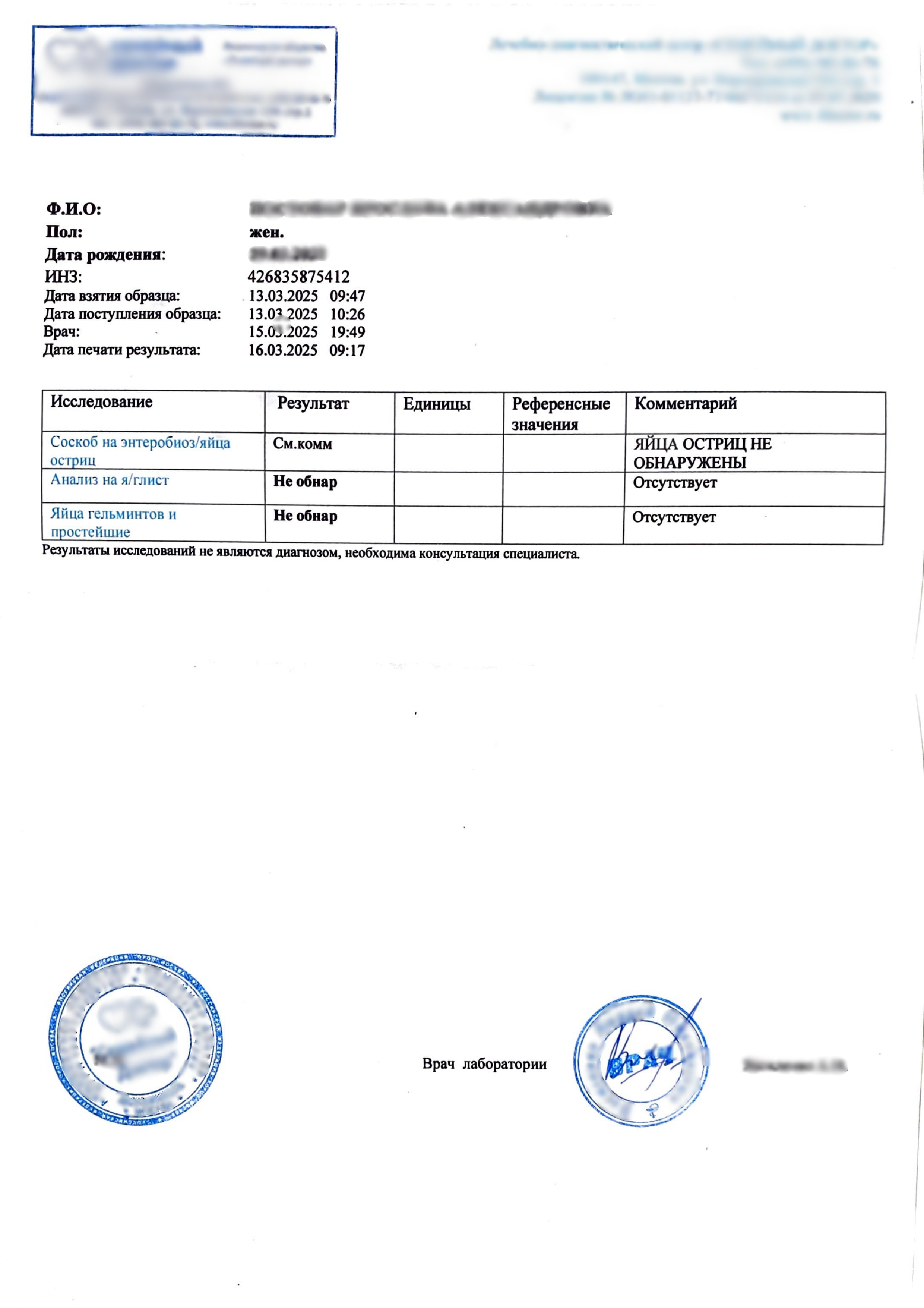 Справка анализ кала - соскоб на энтеробиоз, я/глист и простейшие